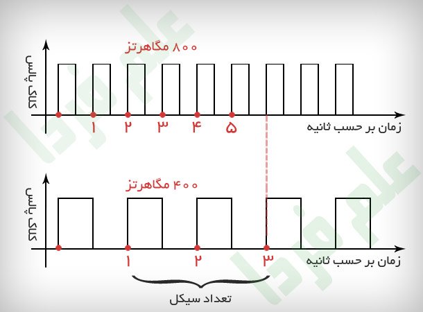 مثلا در شکل زیر می بینید که طی شدن 3 تا کلاک در 400 مگاهرتز ، از نظر زمانی دیرتر از طی شدن 5 تا کلاک در 800 مگاهرتز اتفاق میفته ( با اینکه 5 از 3 بزرگتره )