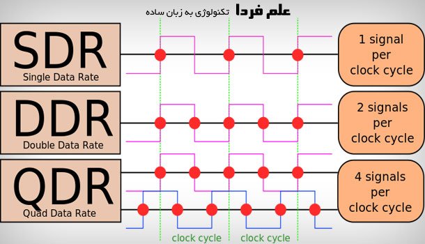 DDR مخفف عبارت Double Data Rate هست به مفهوم مقدار انتقال دیتای دو برابر شده . به زبون ساده قبل از اختراع تکنولوژی DDR ، از تکنولوژی SDR یا Single Data Rate استفاده میشد . یعنی در هر کلاک پالس ، یک بیت منتقل میشد . که خب سرعت کندی محسوب میشد . بعدها در سال 2000 تکنولوژی DDR معرفی شد که در هر کلاک پالس 2 بیت رو منتقل میکرد ، یعنی با این کار سرعت رم ها دو برابر شد . در واقع رم ها جوری طراحی شدن که در لبه بالارونده یک بیت و در لبه پایین رونده هم یک بیت منتقل شه . این در حالی بود که در SDR فقط در لبه بالارونده کلاک پالس یک بیت منتقل میشد . در شکل زیر می بینید که در DDR ، هم در لبه پایین رونده کلاک و هم در لبه بالارونده کلاک ، دیتا منتقل میشه ! نسل بعدی هم که QDR هست تو هر کلاک پالس ، 4 بیت دیتا منتقل میشه .